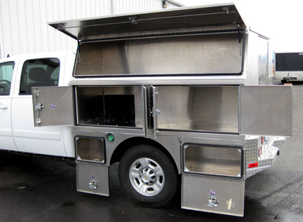 What about installation? They're shipped already assembled and we can ship directly to your door or to your mechanic if you like. Their easy to install. It only takes an electric drill and some simple hand tools. It's nice to have a forklift to get it off the freight truck. However, you can just slide it off most of the way and let it drop to the ground. Remember, it's aluminum! You won't hurt it. It's also nice to have a fork lift or front end loader to install it. But, you can also place it on your pickup with four healthy men. Of course, if you order a large body, it will need to be installed by us or a mechanic. We have a tech support staff (during week days) that will answer any questions that may arise. Sales support 7 days. We've been doing this for years with our service body's, flatbeds, and other products we manufacture. It's not a problem. |
